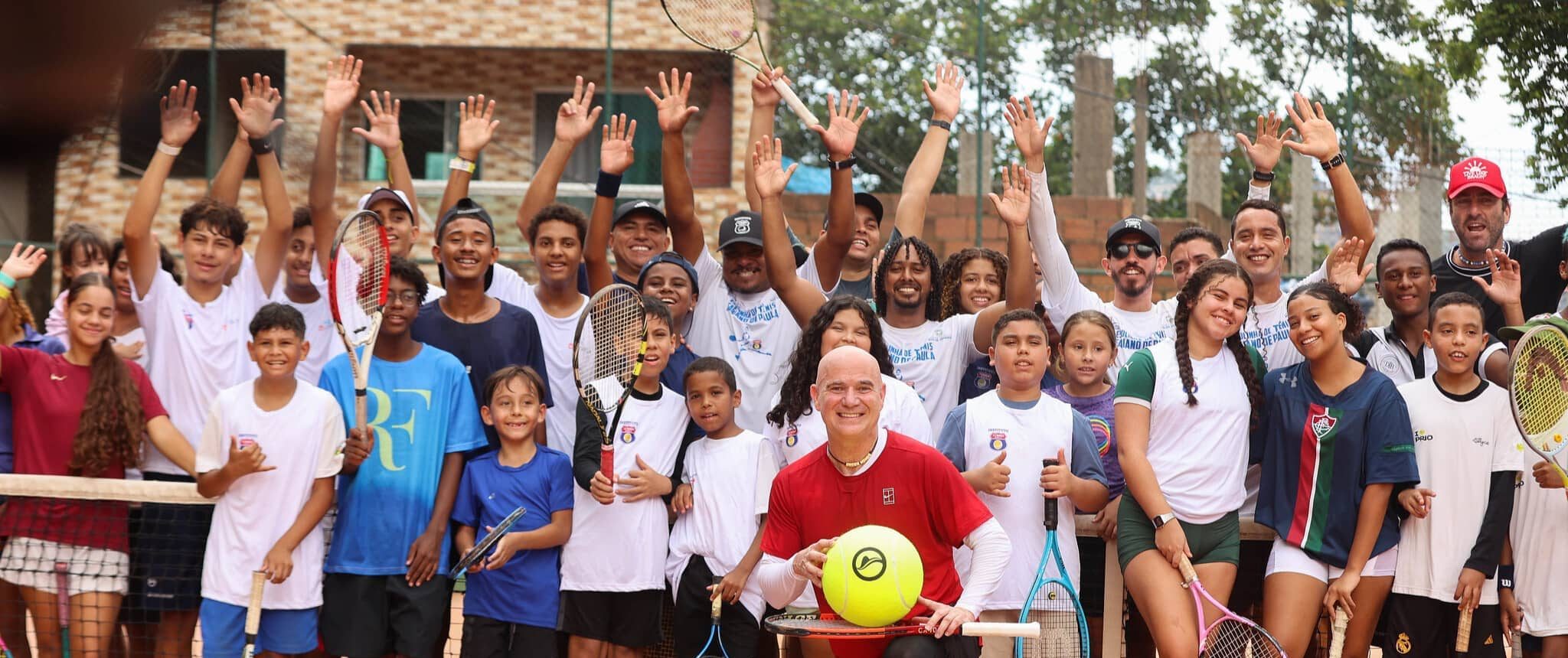 Agassi bateu bola com crianças e adolescentes do projeto social Escolinha Fabiano de Paula, que ensina tênis em uma quadra construída dentro da comunidade da Rocinha.